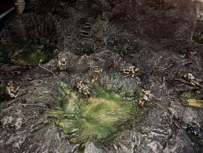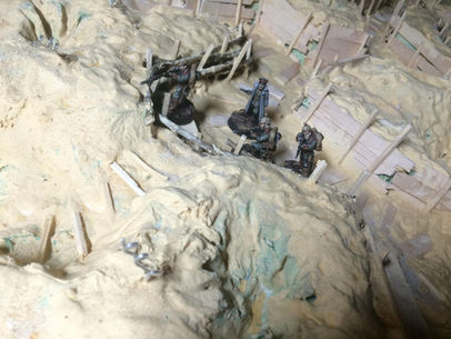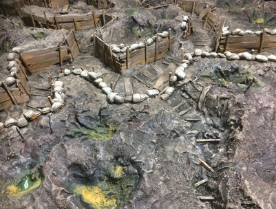 As the final project for an illustration class at Georgia State University, we were asked to illustrate a passage from a book. I chose the memoir of a British officer at the 1915 Battle of Loos. I was able to find somewhat contemporary aerial photography, archaeological dig reports, and even trench maps from both sides to inform my design. The red rectangles on the maps represent the roughly 96 foot by 192 section of Hollenzollern Redoubt I have represented in this 1:48 scale (2 foot by 4 foot) sculpture. The names on the street signs are taken from German trench maps and a number of historically accurate construction techniques are represented on the trench walls.